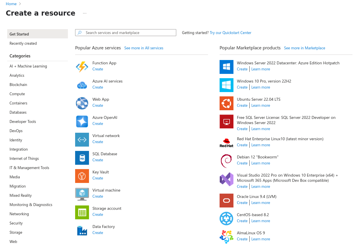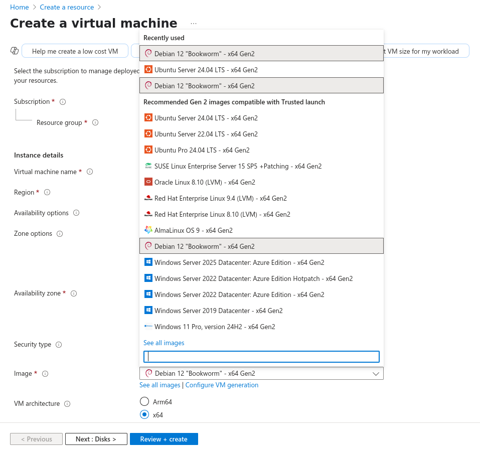 Create a resource > select Ubuntu Server 24.04 LTS or Debian 12 "Bookworm"