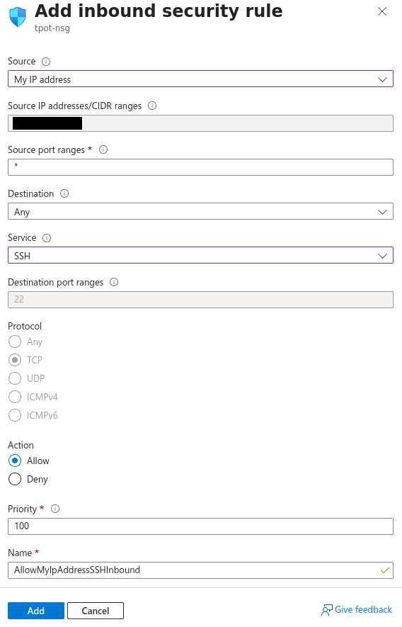 Source IP addresses/CIDR ranges: {your public IP}